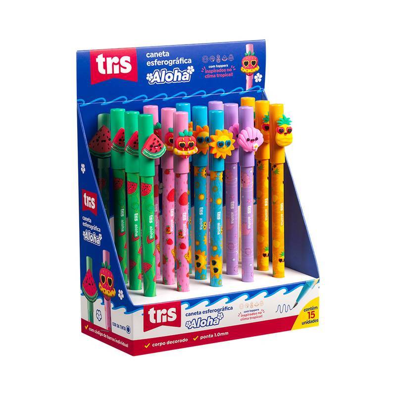A caneta esferográfica Tris Aloha possui toppers exclusivos, inspirados no clima tropical! Sua ponta é média, 1.0mm e seu corpo é estampado. Tinta azul!