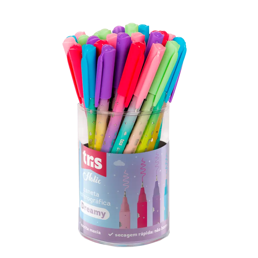 Seja nas passarelas, na papelaria e, até mesmo no Tik Tok e as tendências tie dye e rainbow estão em alta. Agora imagine esta combinação em tons pastel: Bem-vindos a linha Holic Dreamy! A caneta esferográfica Tris Holic Dreamy possui 5 estampas e cores de tinta diferentes. Com ponta fina, secagem rápida e escrita macia.