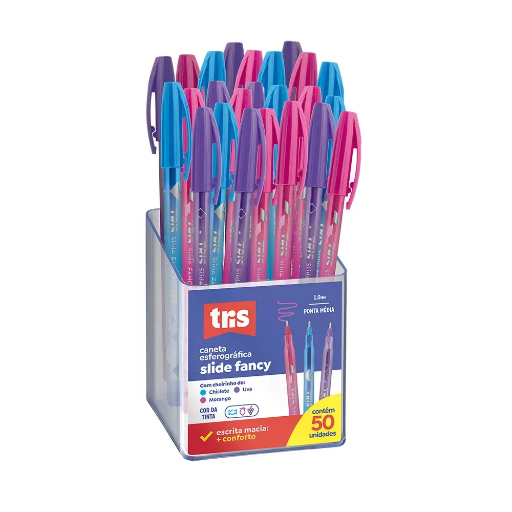 A caneta Slide Fancy possui o corpo decorado metalizado! São 4 modelos incríveis pra você escolher. Ela possui ponta média 1.0mm, tampa ventilada, secagem rápida que não borra e uma escrita super macia! Tem tinta com cheirinho! Com 4 cores marcantes sortidas: verde, azul, roxo e rosa.