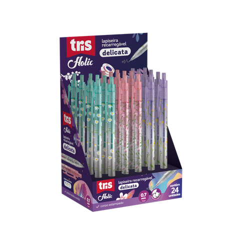 Cores vibrantes, gradientes, texturas florais holográficas e formas abstratas compõem a coleção Garden, inspirada em um jardim futurista. A lapiseira Delicata possui 3 lindas estampas florais com degradês de cores sortidas, além de ponta metálica retrátil, clip e traço 0.7mm.